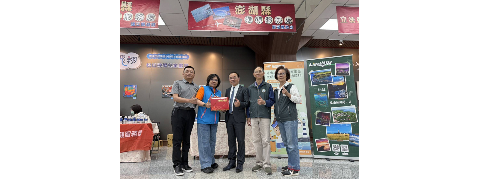 115年2月14日 許明仁理事長偕同夫人早上至松山機場澎湖縣政府澎湖鄉親服務處櫃台,慰勉縣府工作人員辛勞,互贈禮品,活動場景